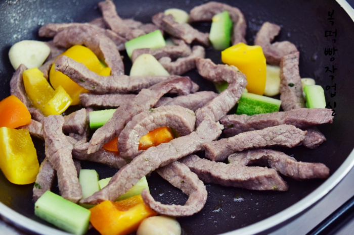 달군 팬에 기름 두르고 소고기, 채소 볶아 주세요.