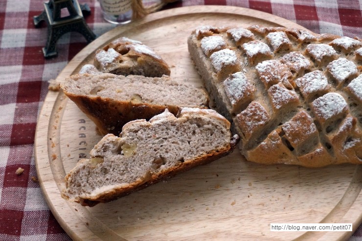 강력분 250g | 호밀가루 80g | 설탕 25g | 인스턴트 드라이 이스트 6g | 소금 3g | 버터 25g | 호두 60g | 우유 150~200g(150을 먼저 넣고 반죽의 상태를 봐가면서 더 넣어주세요.)