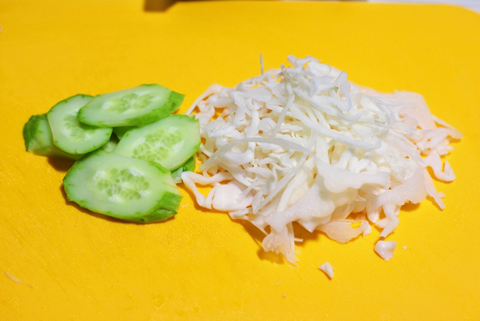 빵이 구워지는 사이 오이는 어슷하게 썰고 양배추는 최대한 얇게 썰어주세요. 오이는 모닝빵 하나당 두 조각이면 됩니다.