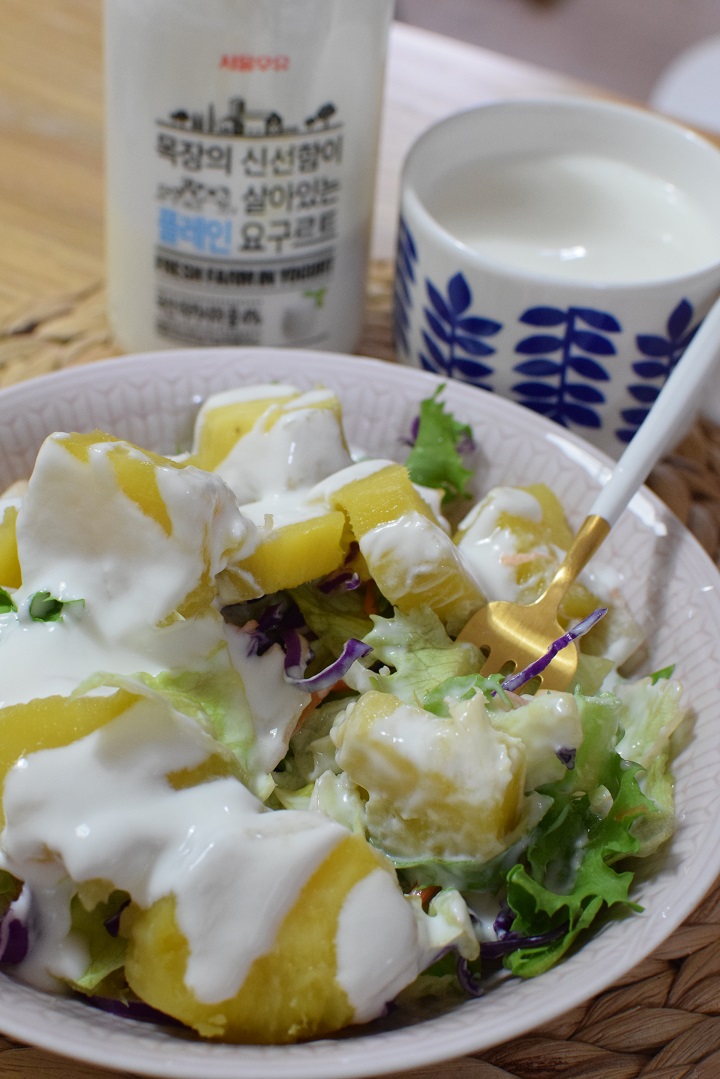 이렇게 부드럽게 서울우유 요구르트 드레싱 얹어서 먹으니까 부드러운 느낌~