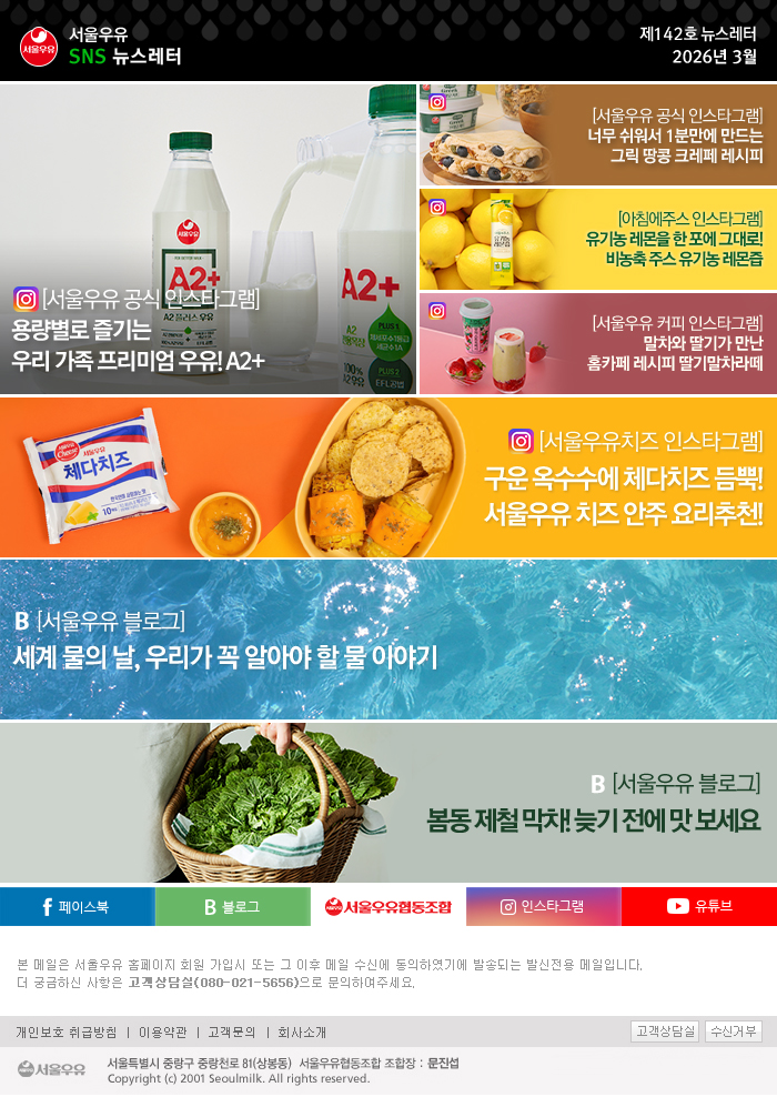 [매거진] 서울우유 SNS 뉴스레터 2026년 3월호 매거진 2026/03/31 11:31 SEOULMILK 2603_SNSNewsletter More from my site세상에 이런 치즈가! 이색 치즈 3[인포그래픽] 와인의 맛을 더해주는 치즈의 종류올리브유와 레몬즙, 같이 먹으면 왜 좋을까요?[매거진] 서울우유 SNS 뉴스레터 2025년 3월호[매거진] 서울우유 SNS 뉴스레터 2023년 3월호[매거진] 서울우유 SNS 뉴스레터 2024년 3월호 Related Posts:설날 날짜는 매년 어떻게 정해질까?2026년 1월 1일 일출 시간 총정리2026년 벚꽃 개화 시기 총정리[매거진] 서울우유 SNS 뉴스레터 2026년 1월호[매거진] 서울우유 SNS 뉴스레터 2026년 2월호