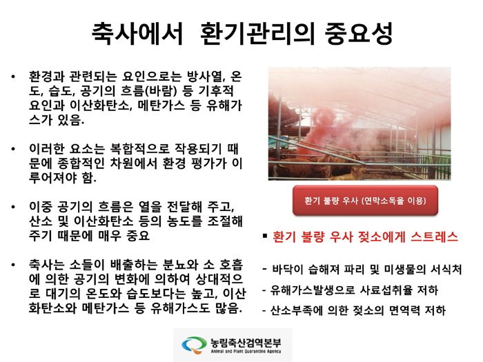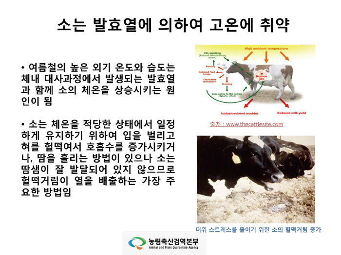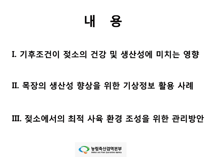 오늘은 그 마지막 시간으로, 농림축산검역본부의 문진산 박사의 발표문 ‘기상정보를 활용한 젖소의 생산성 향상방안’을 게재합니다. 기후조건과 젖소 생산성의 연관 관계 및 젖소의 최적 사육 환경 조성을 위한 내용들이 잘 정리되어 있으니, 전국의 낙농가에서 유용하게 활용하셨으면 좋겠습니다.